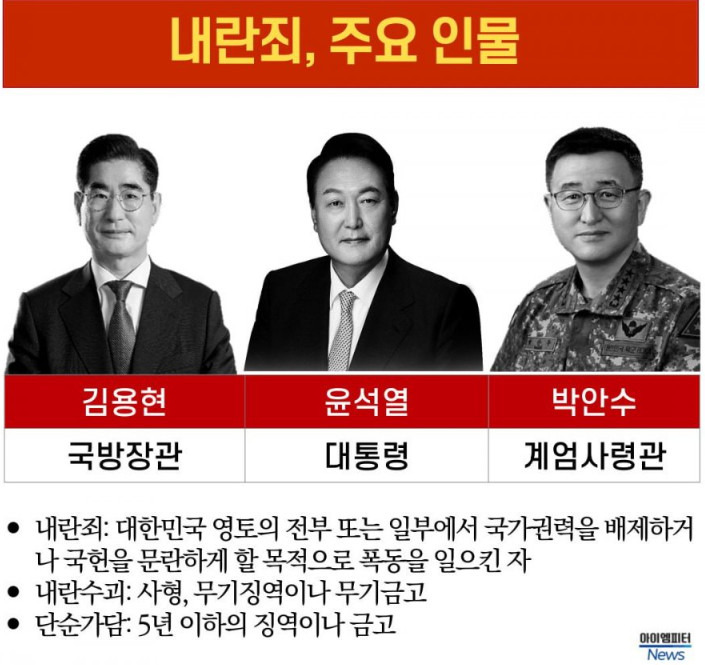 윤석열 반란수괴를 필두로 군대 내 책임자는 국방부장관 김용현, 계엄사령관 박안수, 방첩사령관 여인형, 수도방위사령관 이진우, 특수사령관 곽홍근
