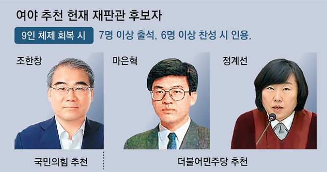 국힘당은 판사 출신인 조한창 변호사(59·18기)를 민주당은 마은혁 서울서부지법 부장판사(61·29기) , 정계선 서울서부지방법원장(55·사법연수원 27기)을 내란 이전에 추천 했었다.
