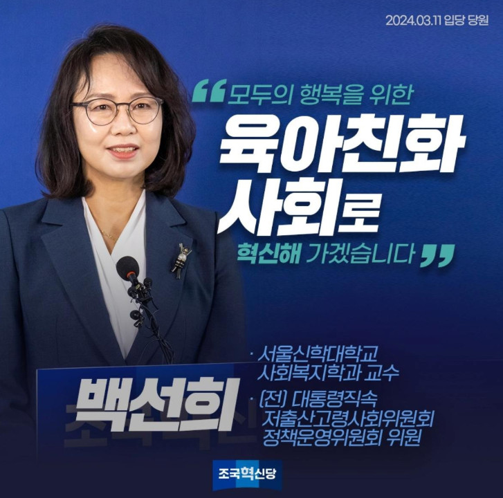 조국혁신당 다음 순번은 비례13번 백선희는 전 저출산고령위원회 정책운영위원으로 서울신학대 사회복지학과 교수다.