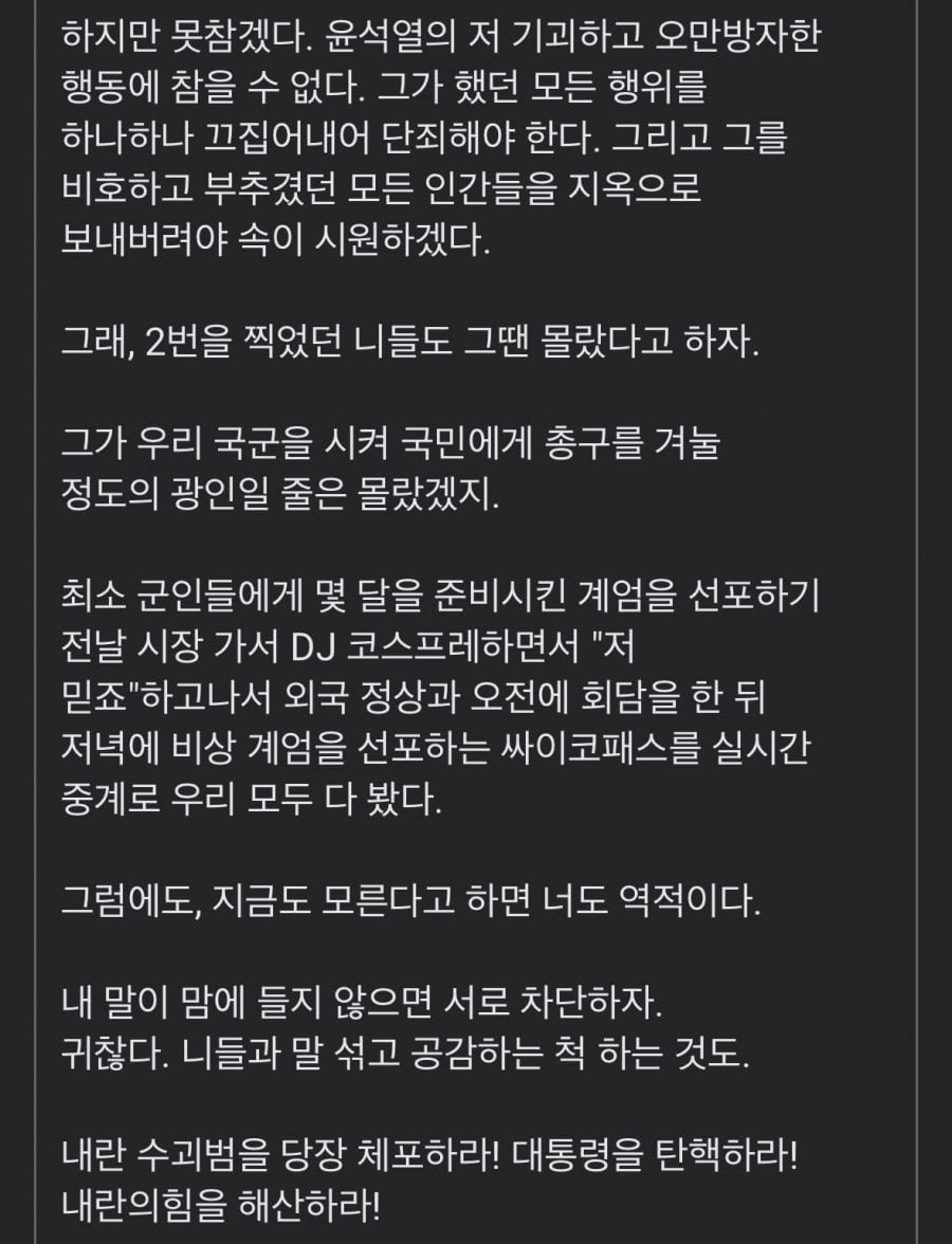 그리고 탄핵 반대 말은 못하고 탄핵을 정치로 만들어 입 다물게 할려는 2찍에게 열 받은 맘카페분.