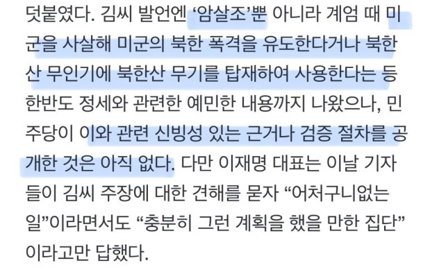 그런 의혹제기 가능. 암살조 이야기는 언론보도 지난 월요일 MBC라디오 김병주 인터뷰를 통해 처음 공개.