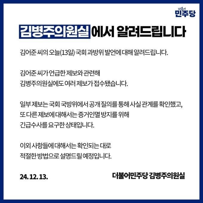 2. " 위험이 계속된다고 판단한 이유는 김건희씨 관련 제보 때문이다. 크게 두가지인데 하나는 김건희씨가 OB(은퇴한 특수요원)에게 독촉 전화를 하고있다.김건희는 자기가 통일 대통령이 될것이라 믿고 있다." 이 주장의 뒷받침은 김선원의원과 김병주 의원이 조사중에 있음.