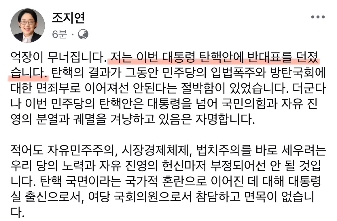 저는 어떤 일이 있어도 대한민국과 주권대 대한민국을 배신하지 않기로 약속했기 때문입니다. 하지만 계엄이 잘못이라고 해서 민주당과 이재명 대표의 폭주와 이재명 대표의 행동이 정당화되는 것은 아닙니다 이재명 대표의 재판 타이머는 멈추지 않고 가고 있습니다. 얼마 안남았습니다. 국민들께 감사드립니다. 비판해주신 국민들께도 감사드립니다.
