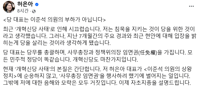 결과적으로 허은아가 이준석 말을 제대로 안들어서 팽시키는 작전 와중에 허은아는 대표라는 권력을 휘둘러 대응하고 있는 모양새인듯. 절대적으로 허은아가 개혁신당을 사당화 할수 있는 여건 자체가 안됨.