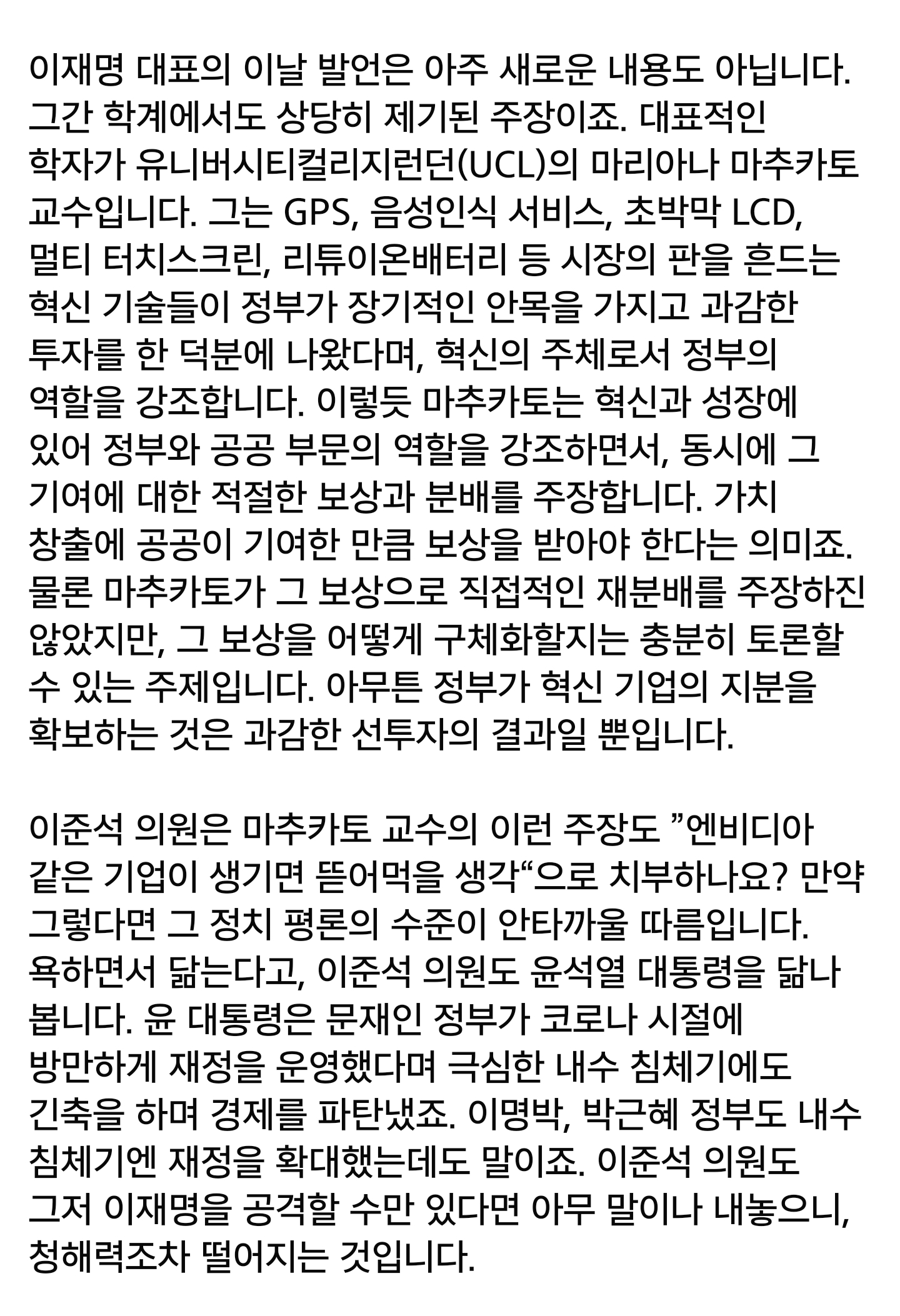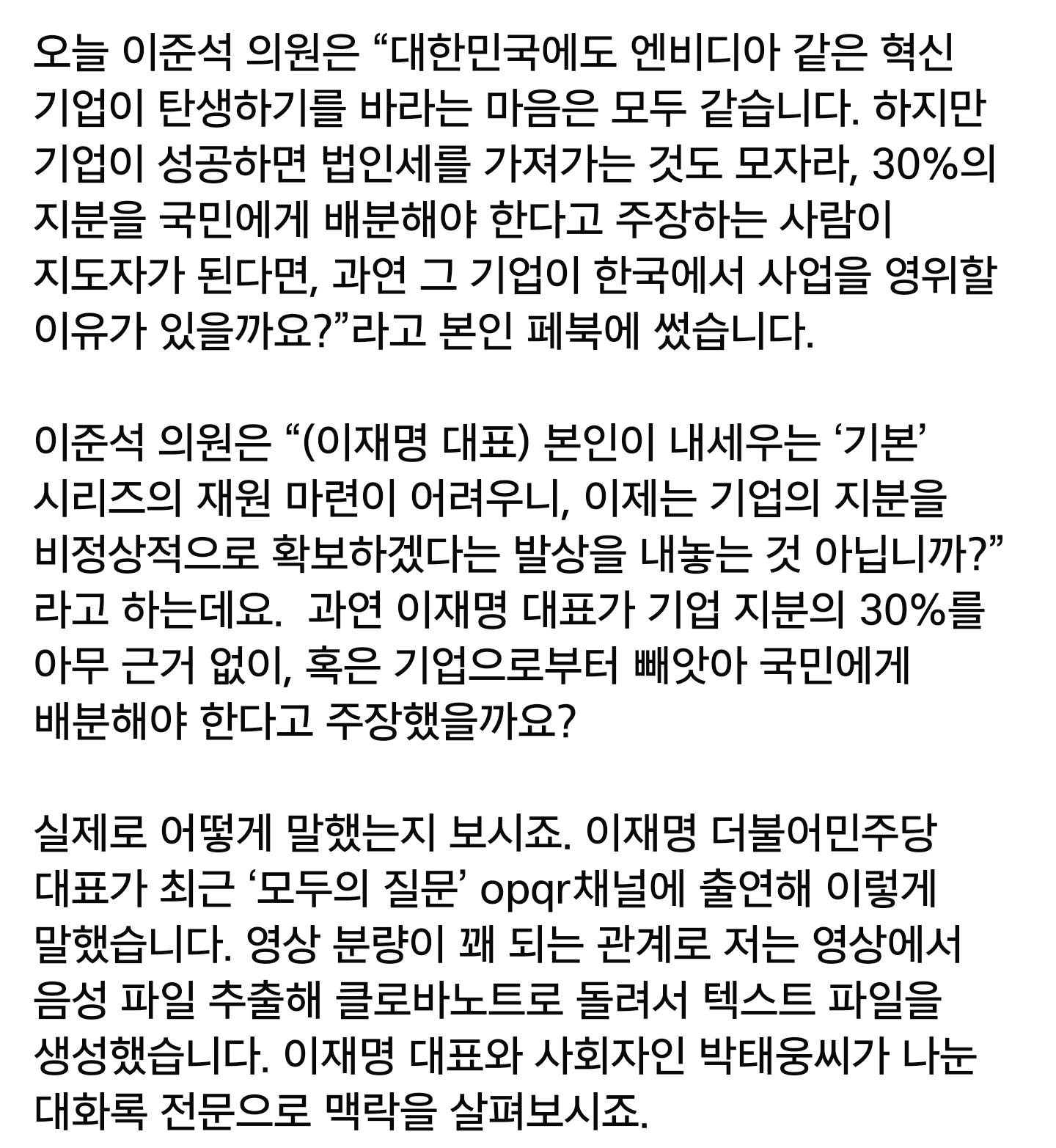 이준석이 이재명의 발언 내용을 모를리는 없지만 국힘당과 같은 자기 지지자들만을 위한 개떡같은 왜곡하는 정무적 판단으로 일단 뭉개는거라고 본다. 설마 다 듣고도 저런 개소릴 했다면 심각하다. 병이다.