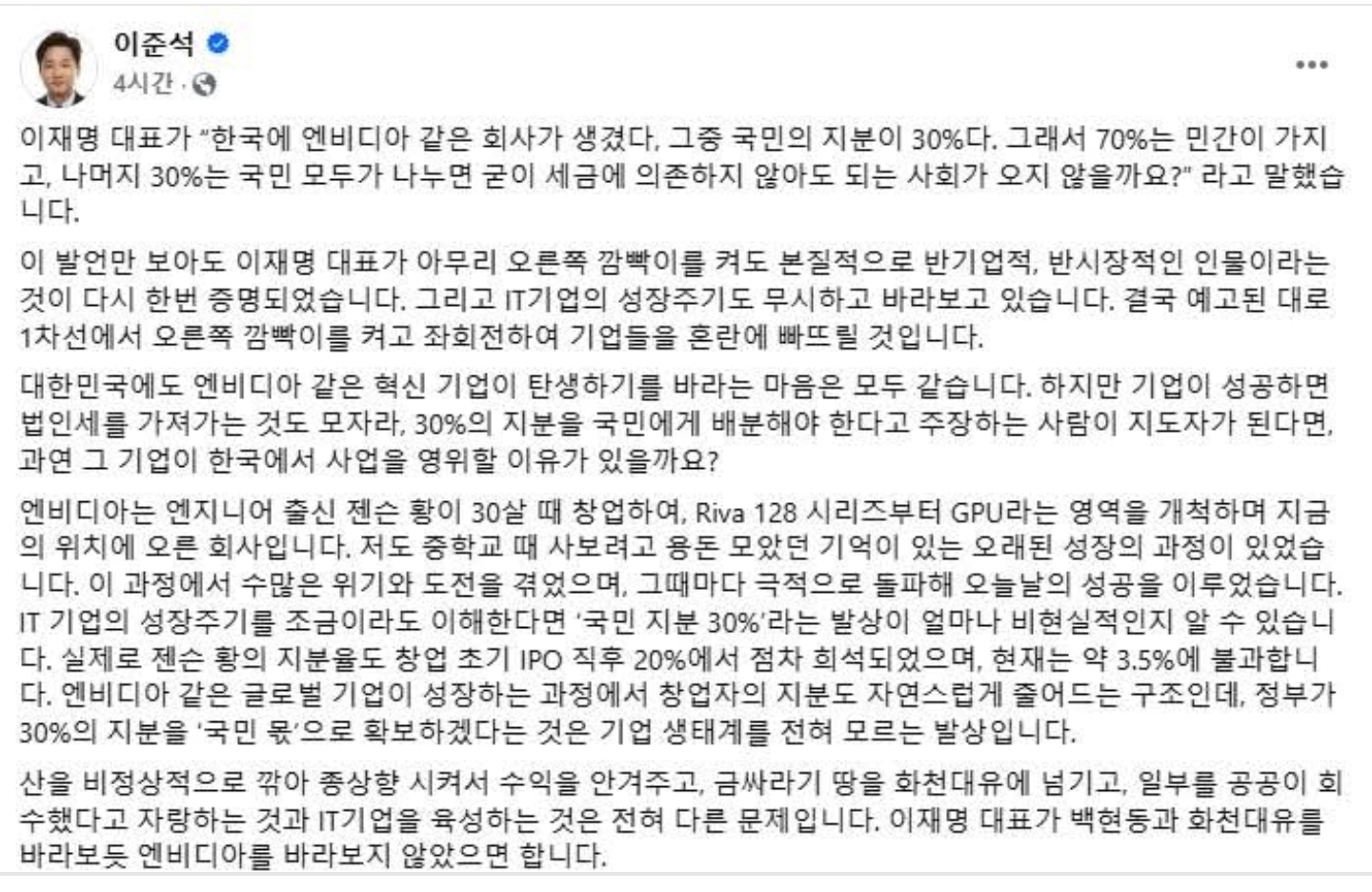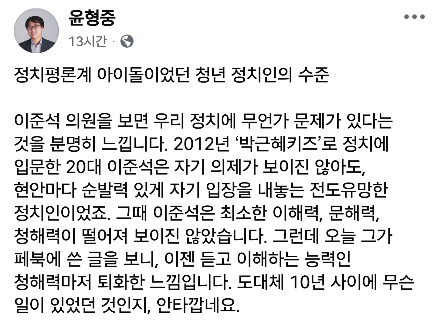 LAB2050 대표 윤형중이 이준석의 글을 보고 이런 글을 남긴다