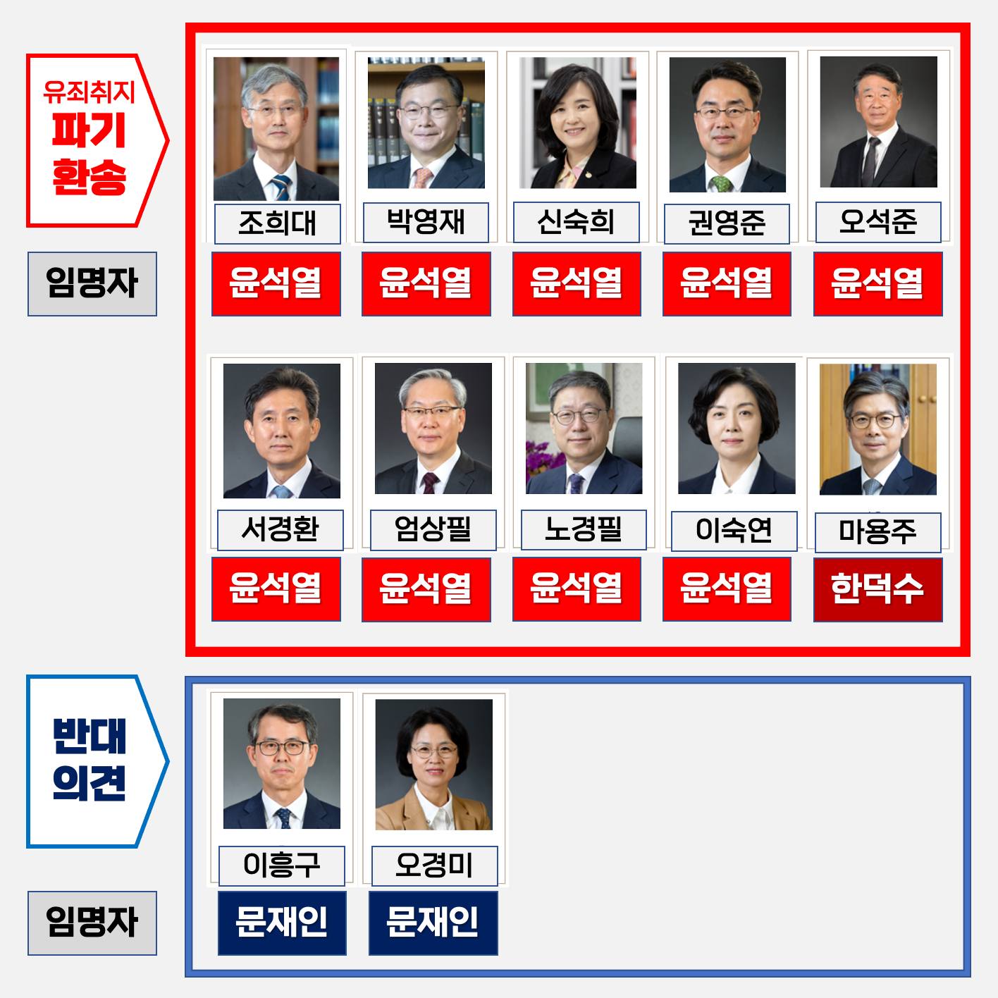 - 오석준 대법관: 800원 횡령한 버스기사는 해임이 적법하다 판결, 그러나 85만 원 유흥접대 받은 검사 면직은 취소. 금액의 차이가 아니라 계급의 차이가 보인다.
