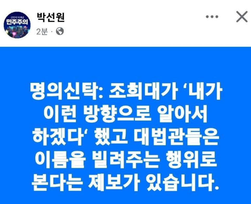 아마도 이것이 윤석열 케비넷에 숨겨져 있던, 조희대의 아킬레스건이 아닐까? 이런 약점으로 인해 내란에도 관여 하지 않았을까 하는 합리적의심. 도대체 법원 개혁은 엄두를 내지 못하는 부분인데 왜 정치에 끼여들었을지 이해가 안가잖아. 자기 인생을 걸어야 하는건데. 다른 대법관들 역시 하나 이상은 걸려 있지 않을까?