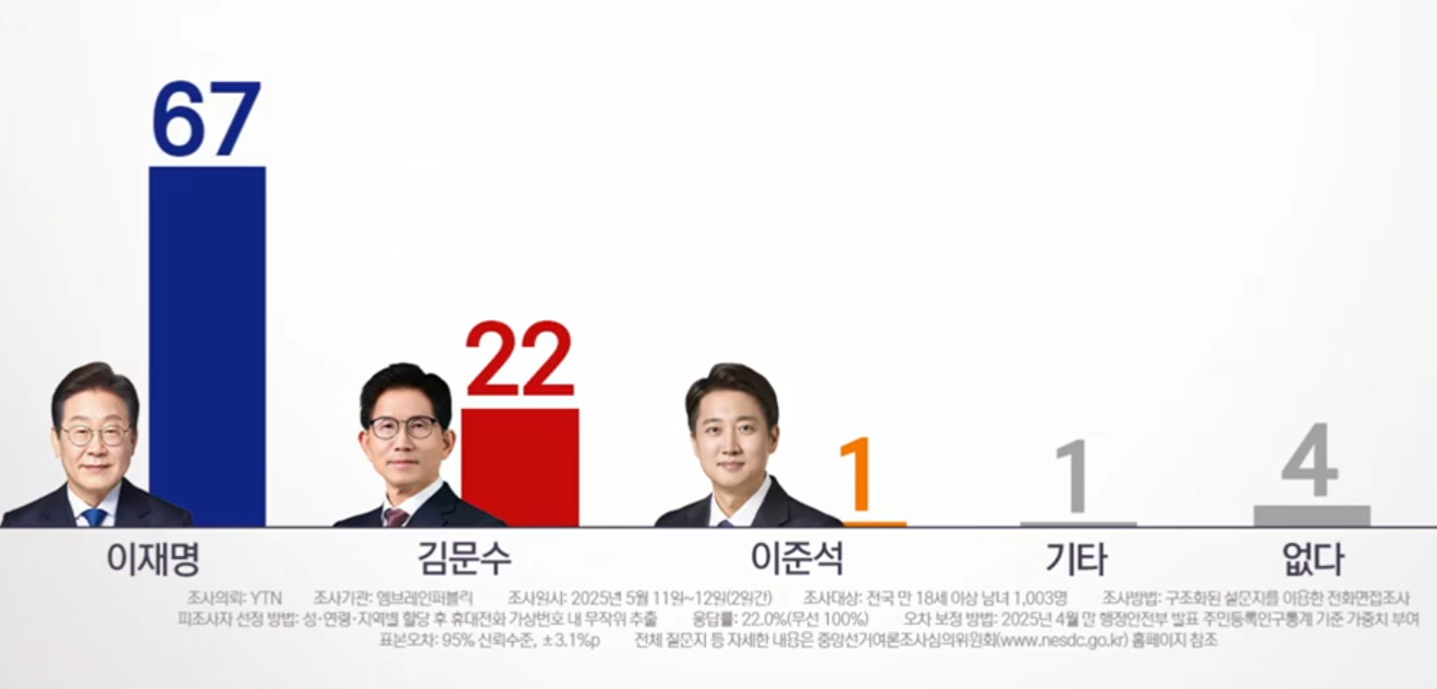 이재명 49.5%, 김문수 38.2%, 이준석 5.7%