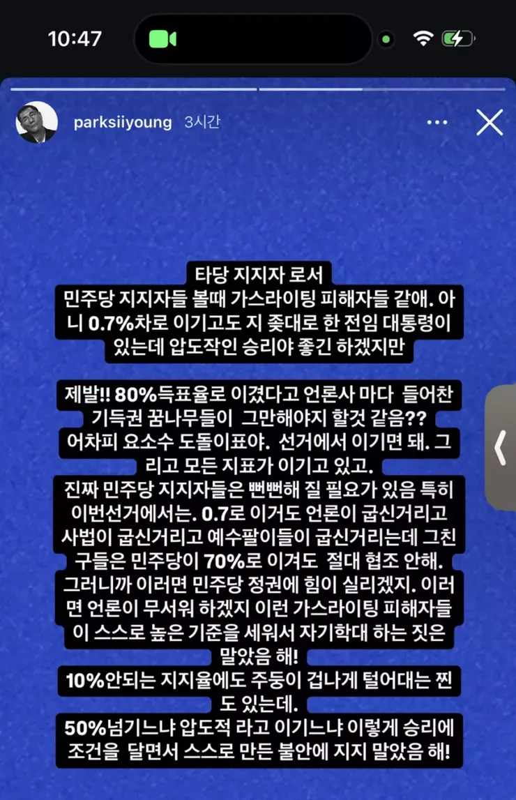 자신들이 민주당을 안 찍는 게 일종의 협박이거나 트롤, 혹은 민주당 지지층인 4~50대를 꼴받게 하는 저항적 행위라고 생각하더라고. 흠… 여기서 제일 이해하는 게 어려웠어. 고작 1표잖아, 우리 모두. 동일하게. 남들 다 가지고 있는 투표권인데 왜 저들의 투표권을 남들이 탐낸다고 여길까? 그리고 모든 세대는 이전 부모 세대를 부정하고 거부해. 지난 인류사 내내. 그게 뒤로 가기도 하고 앞으로 가기도 하고… 요즘 정규 교육 과정에 정반합이라는 거 안 배우나? 그러니까 그냥 민주당 안 찍는 게 뭐 그리 유난 떨 일도 아니고 안타까운 일도 아니란 말이여. 이것도 저들이 저들 스스로를 얼마나 과대평가하며 현실을 회피하고 있는지 잘 알 수 있는 대목이더라고.