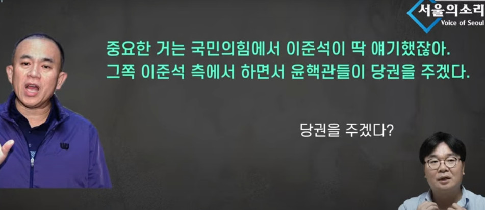 신용한 : 그리고 쌍권이 만약에 그런 제안을 진짜로 했다고 하면, 좀 전에 주진우 기자님하고 밖에서 이제 말씀 나누다가 과연 그러면 누가 역할을 할까 해서 그 쌍권과 홍준표 전 후보와 이준석 사이를 정확히 연계 고리가 있는 분이 있어요. 근데 그분 말을 이준석 후보가 굉장히 잘 듣는, 굉장히 상의도 많이 하고 잘 듣는 분이 있습니다. 명태균?