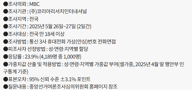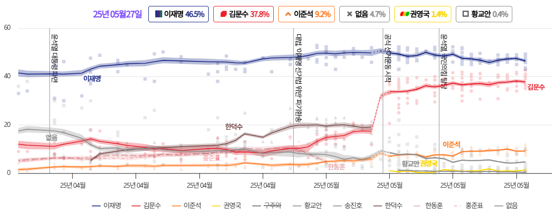 코리아 리서치 (26~27일, 1천명) 이재명 43%, 김문수 36%, 이준석 11%