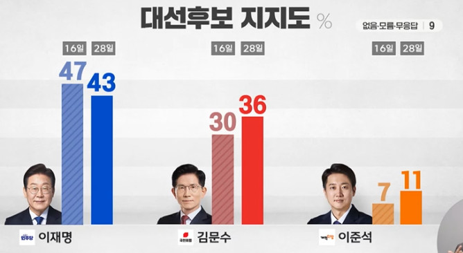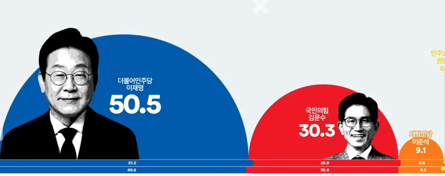 이재명 50.5% 김문수30.3% 이준석 9.1%