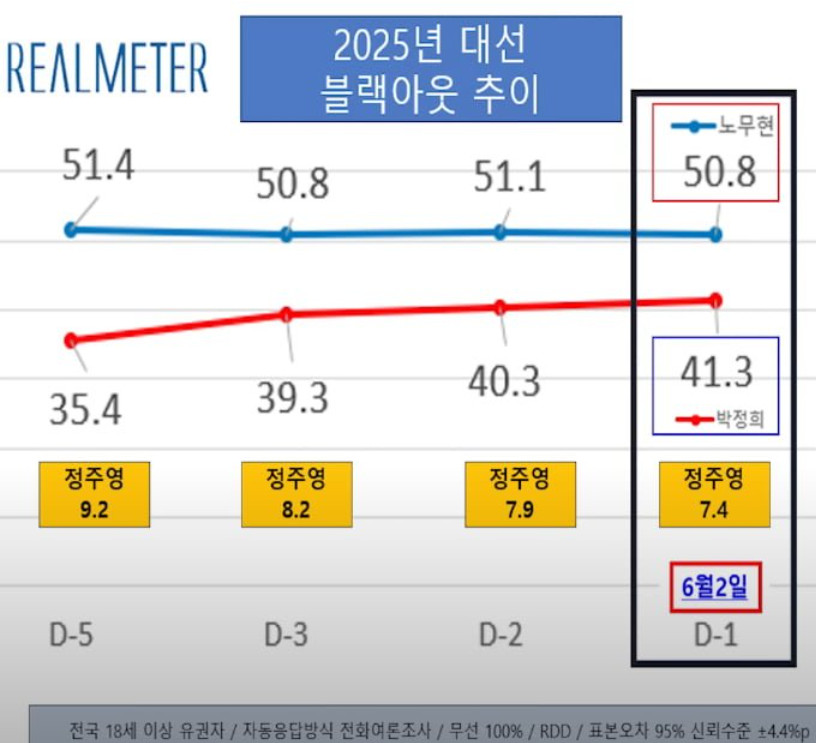 여론조사 블랙아웃을 피해 리얼미터가 노무현,박정희 , 정주영으로 조사하는 편법을 썼다. 계속 여조를 이렇게 돌린다고 한다.