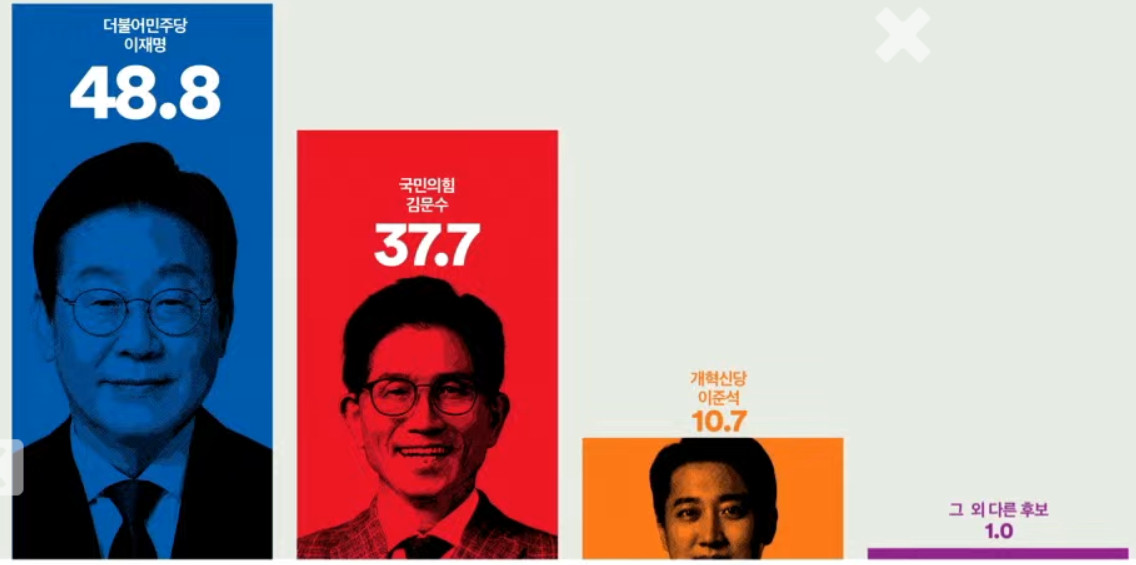 이재명 48.8% 김문수37.7% 이준석 10.7%