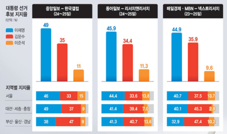 갤럽(1천명 20~22일) : 이재명 45% 김문수 36% 이준석 10%
