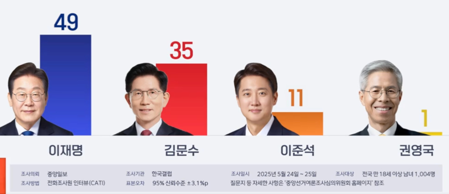 갤럽(1천명 24~25일) 이재명 49%, 김문수 35%, 이준석 11%