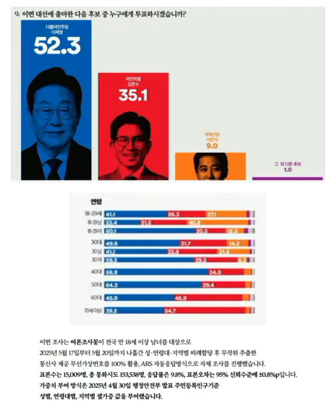 꽃 17~20일 1만5천명 / 이재명 52.3% 김문수 35.1% 이준석 9.0%