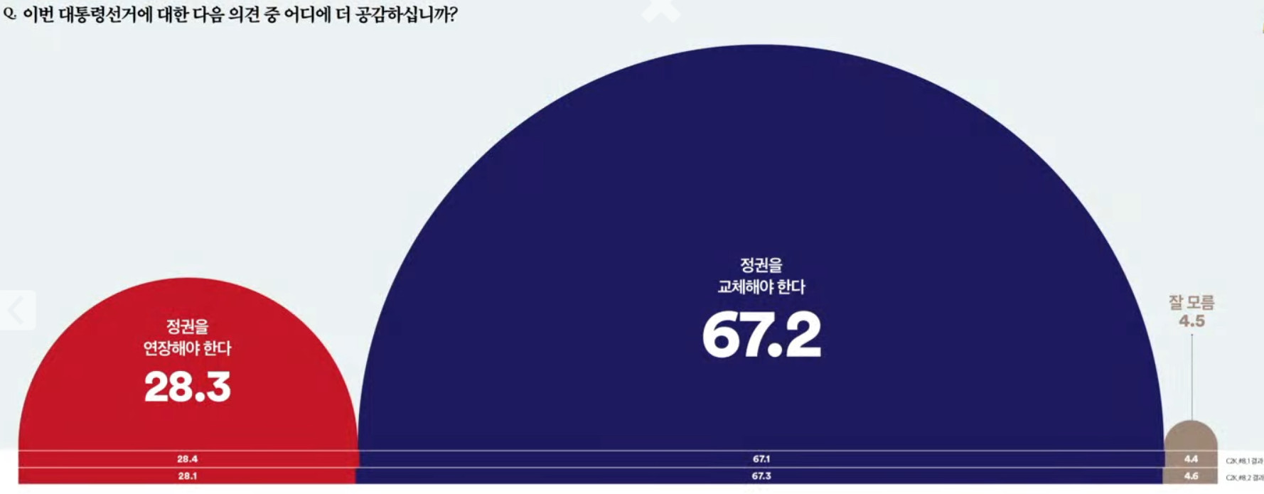 그런데 같은 21~22일 꽃의 여조를 보면 정권교체 쪽은 크게 변화가 없다.