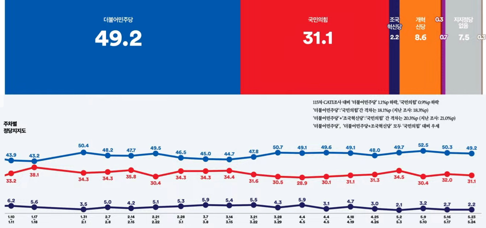 꽃(2천명, 23~24일) 이재명 48.9% 김문수30.8% 이준석 9.6%