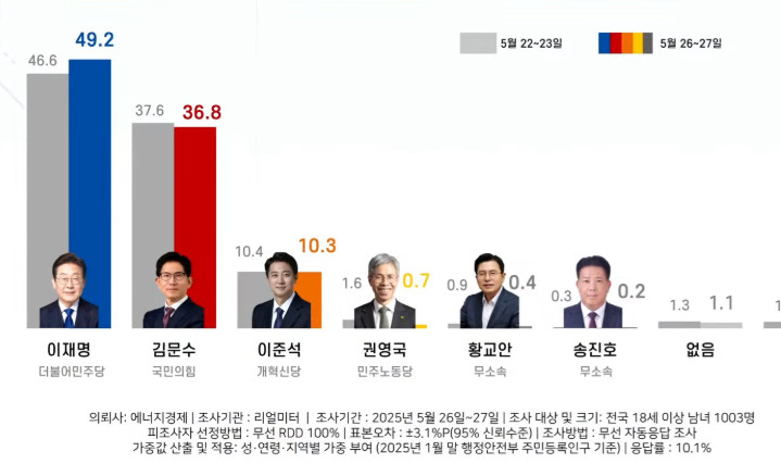 리얼미터 26~27일 1천명 / 이재명 49.2% 김문수 36.8% 이준석 10.3%