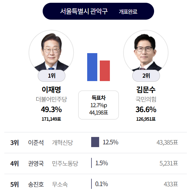 관악구는 그동안 민주당의 텃밭인데 총선 비교를 해 봐도 이재명 득표율이 이것 밖에 안된다는 것은 민주당 젊은 지지층이 이준석에 갔다고 봐야한다.. 박민규나 정태호가 2030 표 관리를 못했다는 뜻인데..