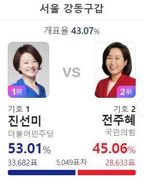 나경원 지역 동작구을도 넘어왔는데 도대체 강동구에 무슨 일이 생긴거지 했는데 막판에 역전 했구나. 그런데 강동구 포함 관악구 등 민주당 지역이 지역구 관리가 안되고 있다
