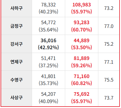 부산, 울산 경남 각 지역 득표율