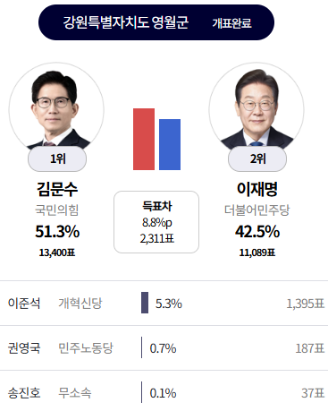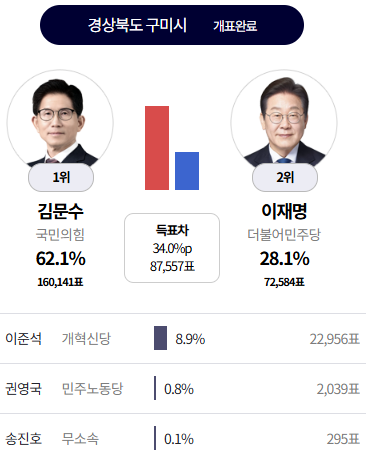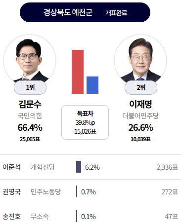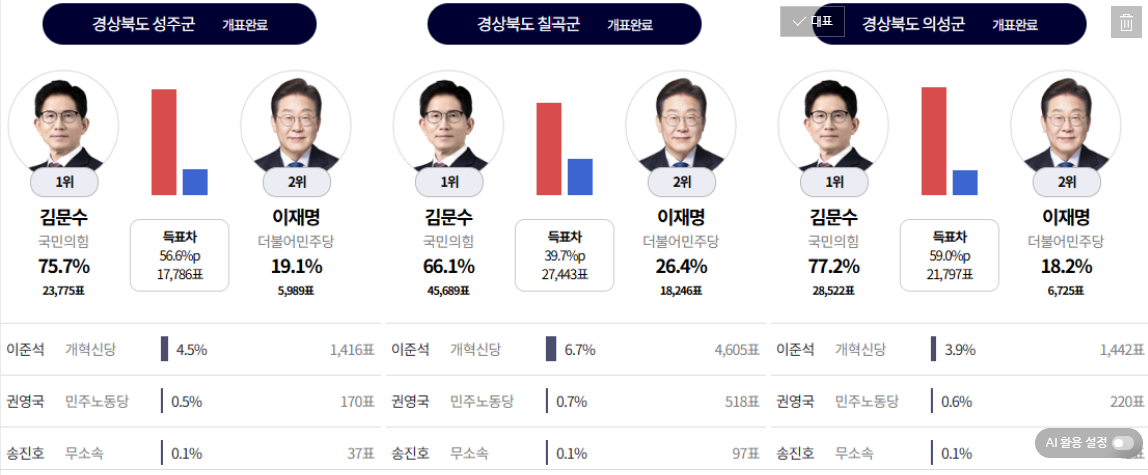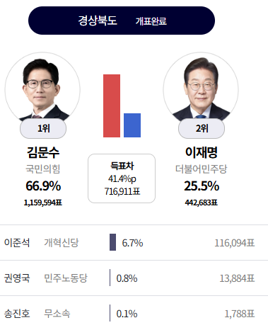 30%를 넘을 수 있을까 했지만 역시나였다. 게다가 이재명의 고향인 안동마저 처참했다. 저러면서도 고향이니 뭐 내놓아라 요구할 철면피들은 아니겠지. 지들도 염치는 있을거야